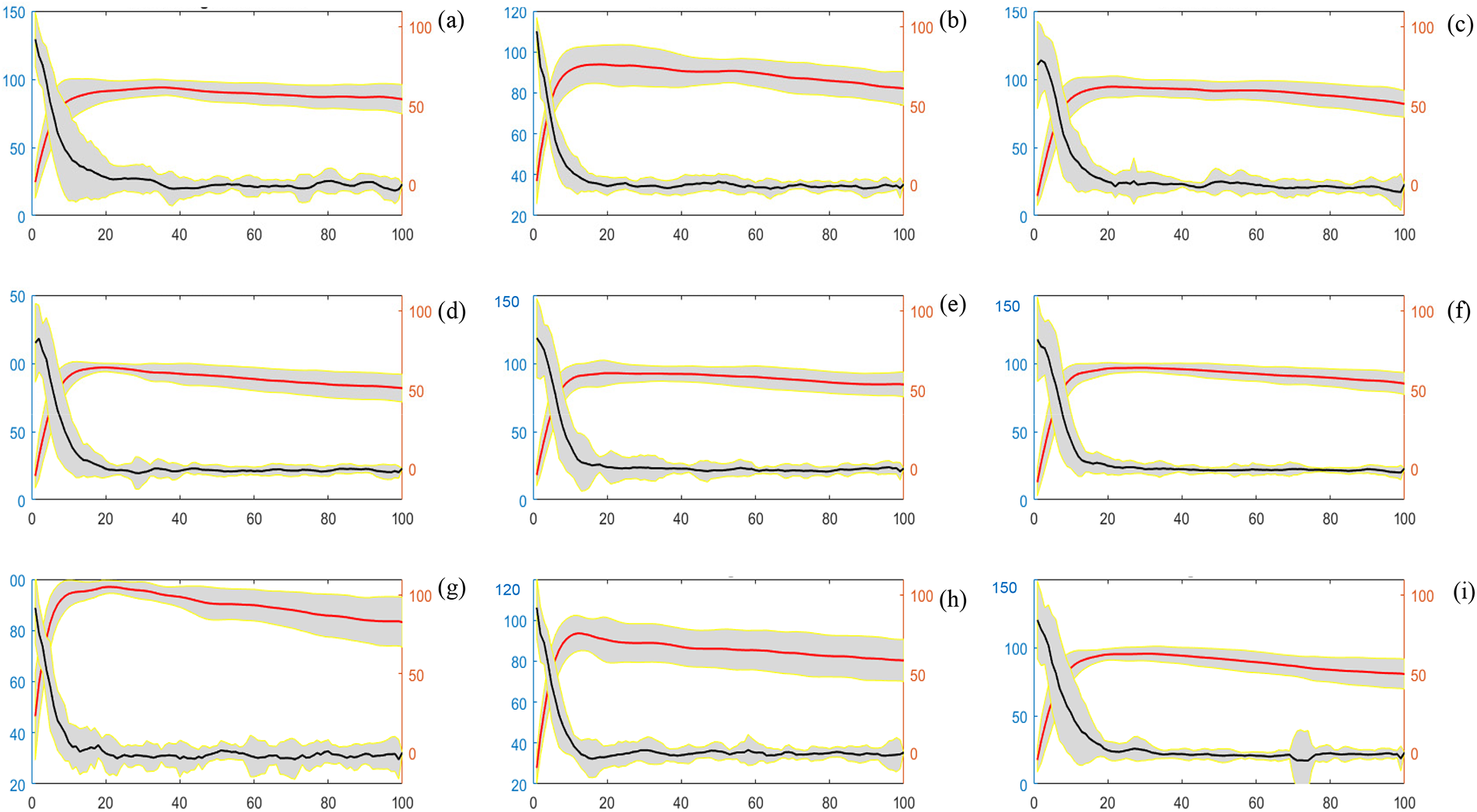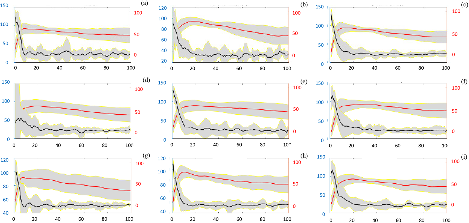 Fig. 2. Behavior of the experimental group strength for each grasp configuration, during 5 s. Numbers in blue are the maximal sustained strength, in red the differential to maximal sustained strength and in black the time, in percentages: (a) Index finger extension, (b) Parallel extension, (c) Small diameter, (d) Abducted thumb, (e) Fixed hook, (f) Medium wrap, (g) Inferior pincer, (h) Ring, (i) Large diameter.