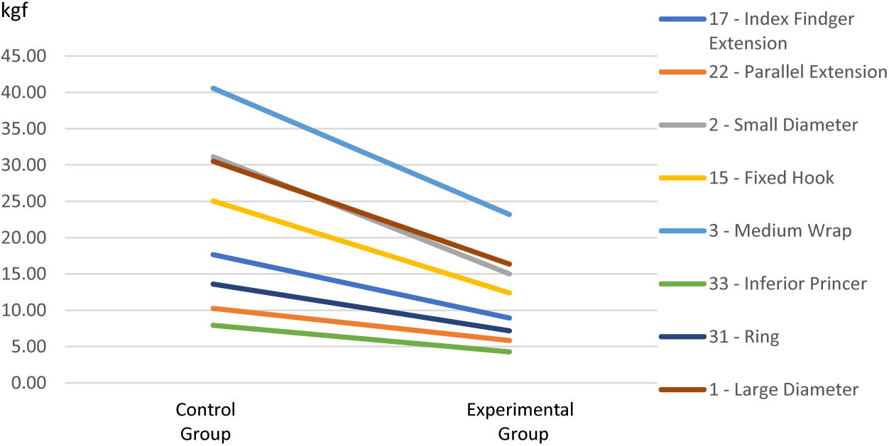When comparing values of strength between groups, there is a decrease in strength, in the experimental group (Fig. 3). The Inferior Pincer and the Parallel Extension are the grasp configurations that require less strength, and they are both precision grasps configurations, using the pads of the fingers to establish contact with the grasped object. The Medium Wrap is the grasp configuration that requires more strength and has also more strength difference between the control and experimental groups (17 kg). The three strongest grasps have the same configuration being the difference in the diameter of the grabbed object and in the assessment position of the dynamometer handle. These are the Medium Wrap (ø4.8 cm), the Large Diameter (ø8.7 cm), and the Small Diameter (ø3.5 cm). These grasp configurations must be assessed with the dynamometer handle positioning according to their diameter: the Medium Wrap in the second position, the Large Diameter in the fifth position, and the Small Diameter in the first position [13].