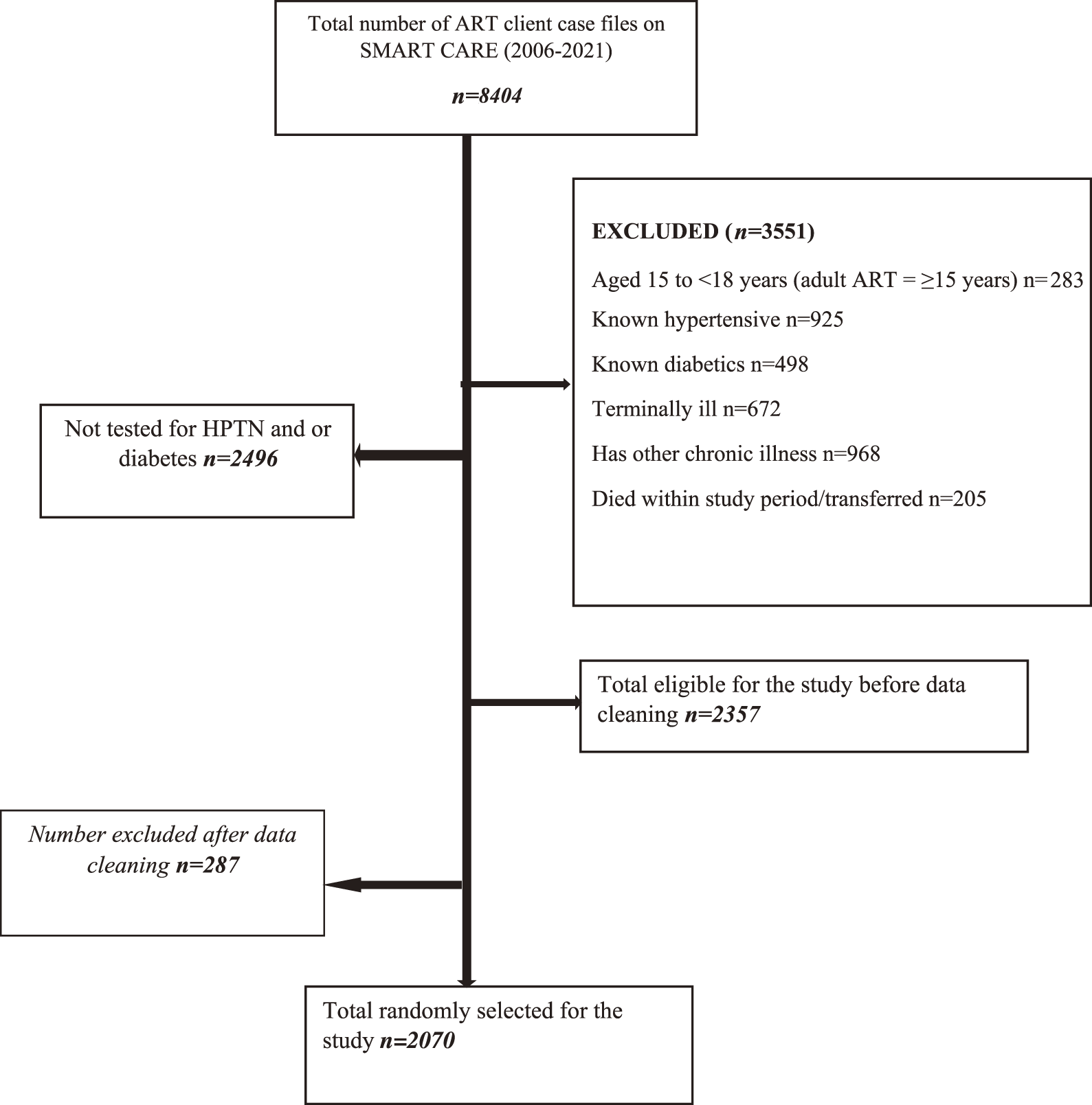 Eligibility was determined based on the inclusion of case files in the SMART CARE database, participant age (18 years or older), and a minimum of one year on ART or HAART from January 2006 to April 2021.